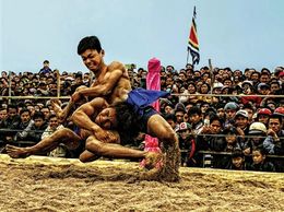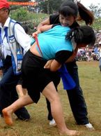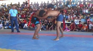 Native to the Mizoram people India, and originated in the village of Dungtlang in 1750. Recognized as a sport after the Mizo migrated from Burma to the Lushai Hills. Strict rules prohibiting kicking, stepping out of the circle and even bending of the knees. Held in a circle 15–16 feet in diameter on mat or grass. The objective is to lift one's opponent off his feet. The matches are held in three rounds each of 30–60 seconds of duration, or until a wrestler either breaks a rule or is lifted off his feet. Another feature of this form of wrestling is the catch-hold belt worn by the wrestlers around the waist. It has to remain tight all through the match.