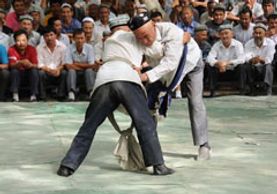 Qielixi 切里西: Chinese Belt wrestling is practiced by the Uyghur Nationality. The Uyghurs are a Turkic ethnic group that live in east and central Asia. Today, Uyghurs live primarily in the Xinjiang Uygur autonomous region of the Peoples Republic of China where they are one of 55 officially recognized ethnic minorities. Uyghurs primarily practice Islam. Like many populations of Central Eurasia, they are genetically related to both Caucasoid and east Asian populations.