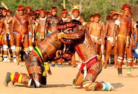 Huka-huka starts with theon their knees. It begins when the owner of the fight, a male chief, walks to the center of the arena and calls his opponents by name. The fighters kneel rotating clockwise in a circle facing the opponent, until they look at each other and cling, trying to lift the opponent and knock him to the ground. The fight is performed by either men and women.