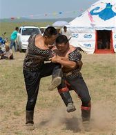 Practiced by the largest indigenous group in Siberia, Buryat Republic a federal district of Russia. They are the major northern subgroup of the Mongols. Buryats share many customs with other Mongols, includingnomadic herding, and erecting gerts for shelter. Today, the majority of Buryats celebrate the Altargana Festival where this style is a jacket-less form of Bokh similar to shuai jiao is contested.