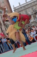 Traditional belt style of the Democratic Republic of Congo. Wrestlers begin in a kneeling position with both hands on opponent belt. At the start, competitors slowly and carefully make their way to a standing position while fighting to keep balance and sure footing while opponents attempts to lift them off the ground. Victory is secured when one athlete touches their back to the ground.