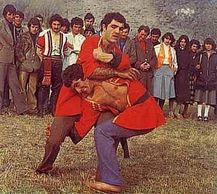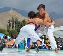 Native to Tajikistan, this belted and jacketed style two men shake hands with both hands, pass through the right hand under the opponentʼs left hand and pull to oneself and try to turn down an opponent.In Tajikistan, during the national New Year Navruz, every village, community, town and city organize a new year open wrestling competition. Men of any profession (not only wrestlers) try and join the competition. According to traditions, children begin the competition, then youngsters continue and after them, the notable wrestlers compete with each other. If somebody is defeated in a village Navruzi wrestling competition, his brother competes with the same opponent to save the familyʼs pride.