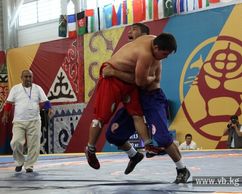 Kyrgyz kurosh is one of the ancient national kinds of wrestling of Kyrgyz people. Athletes wear loose white trousers and the upper body must be bare. They stand facing each other on a special mat and hold the capture of an opponent's belt with both hands. It is allowed to release the belt by one hand during the bout. An athlete who will be able to throw the opponent on the scapula during the bout will be considered as a winner.